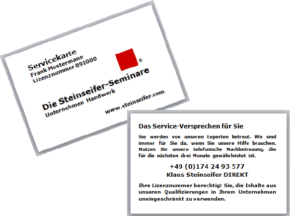 Nach jedem unserer Seminare und Workshops lassen wir Sie nicht alleine. Es ist unser erklärtes Ziel, dass Sie die Inhalte in Ihrem Unternehmen und in Ihrem Leben umsetzen, daraus spürspare Erfolge machen. Dafür sind wir für Sie da und betreuen Sie drei Monate lang kostenlos, per E-Mail oder telefonisch nach. Denn nur mit einer erfolgreichen Umsetztung des Gelernten lohnt sich Ihre Investition in eine unternehmerische Qualifizierung.