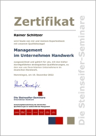 Das Qualifizierungszertifikat erhalten die Seminarteilnehmerinnen und Seminarteilnehmer, die ihre unternehmerischen Qualifizierungen strategisch durchgeführt und damit eine besondere Qualität in der Unternehmensführung und in der Mitarbeiterführung in ihren Unternehmen erreicht haben.