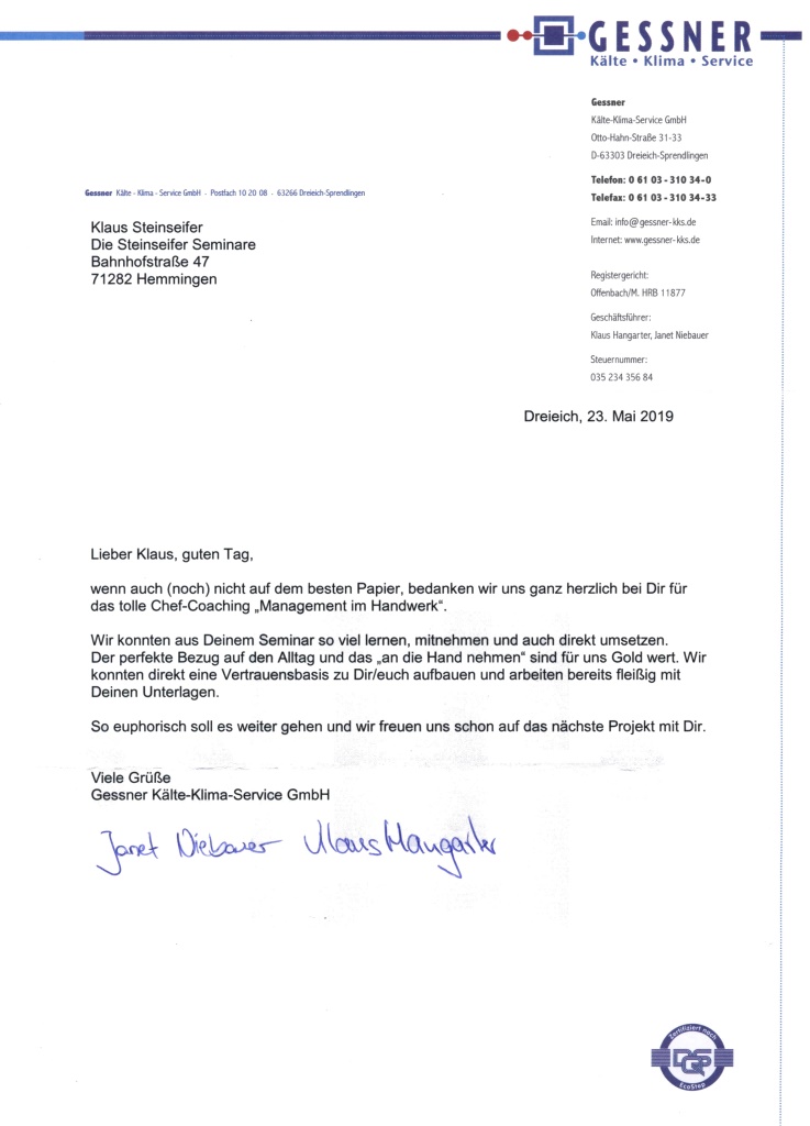 Ein Coaching für die Unternehmensleitung aus der Kälte- und Klimabranche im handwerklichen Management von und mit Klaus Steinseifer