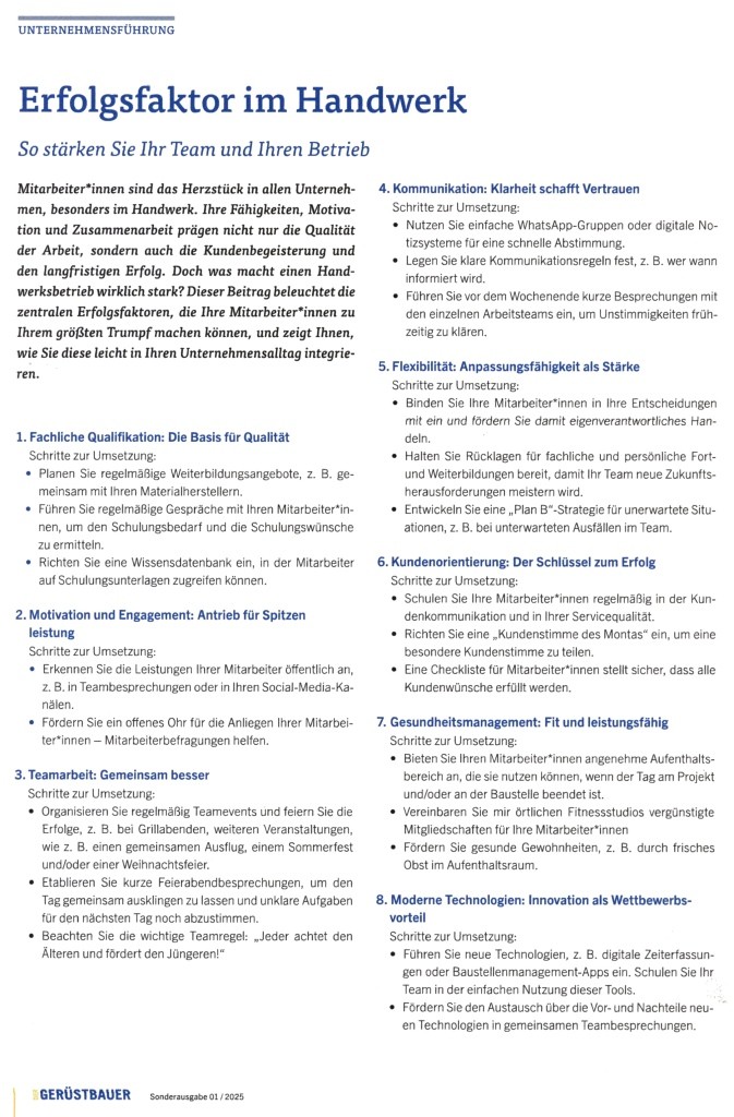 von Klaus Steinseifer für die Chefredaktion "Der Gerüstbauer". Meinen Artikel lesen Sie vollständig in meinem Blog. Ein passendes und intensives Mehrtagesseminar gibt es hier für Sie: Die Cheftage im Handwerk mit dem Chef- und Führungskräfteseminar für die attraktive Unternehmensführung und die zeitgerechte Mitarbeiterführung im Handwerk