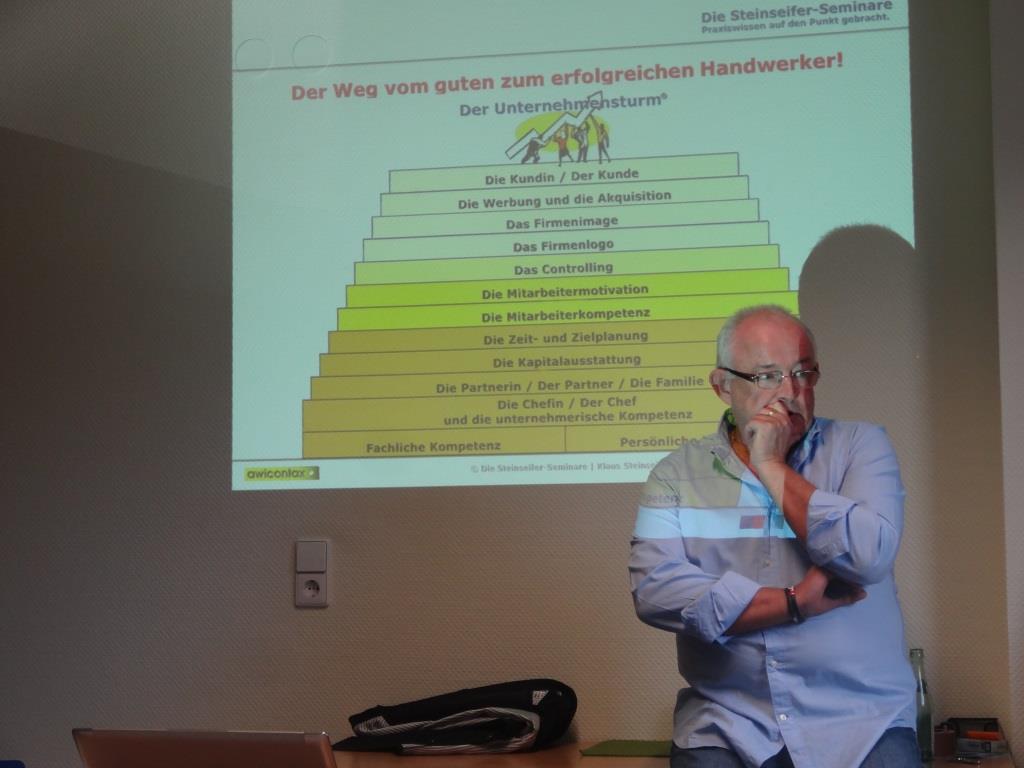 Klaus Steinseifer vermittelte den Teilnehmerinnen und Teilnehmern anhand des Unternehmensturms eine strategische und erfolgreiche Unternehmensführung in einem Handwerksunternehmen, die zukunftsorientiert ausgerichtet ist, nachhaltig wirkt und erfolgreich für eine Arbeitgebermarke und Kundenmarke sorgt.