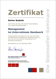 Das Qualifizierungszertifikat erhalten die Seminarteilnehmerinnen und Seminarteilnehmer, die ihre unternehmerischen Qualifizierungen strategisch durchgeführt und damit eine besondere Qualität in der Unternehmensführung und in der Mitarbeiterführung in ihren Unternehmen erreicht haben.