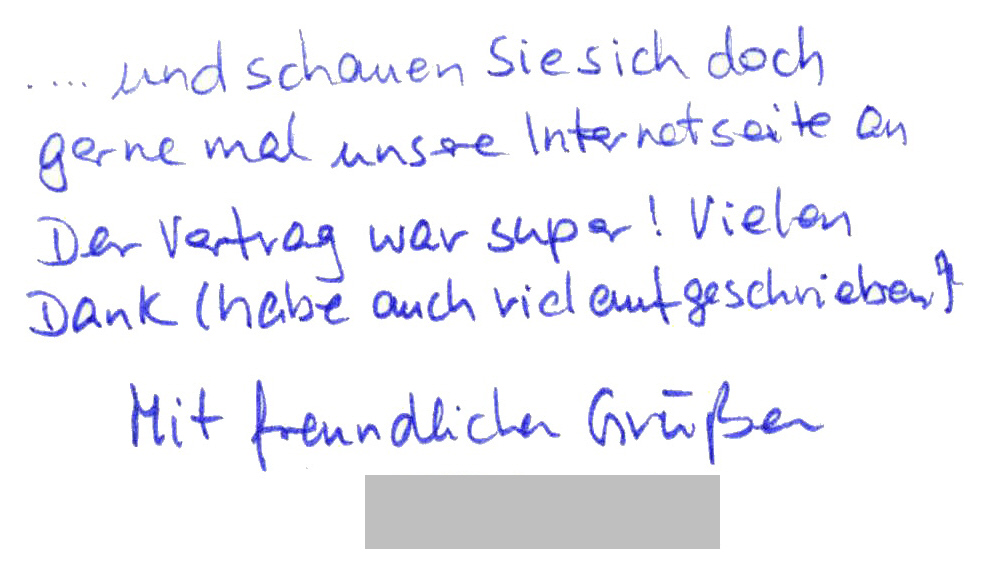 Danke für den gestrigen interessanten Einblick! Es gab einige Punkte in dem man seinen eignen Handlungsbedarf erkannt hat! Ich werde mich später einmal in eins von Ihren Seminaren begeben! Ich glaube mein früherer Chef hat ein Seminar bei Ihnen besucht, B. W.? Ich hoffe, Luxembourg hat Ihnen gefallen?