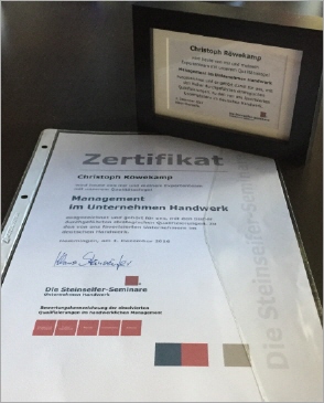 Das Qualifizierungszertifikat erhalten die Seminarteilnehmer, die ihre unternehmerische Qualifizierung strategisch durchgeführt und damit eine besondere Qualität im Management im Handwerk und in ihren Unternehmen erreicht haben.